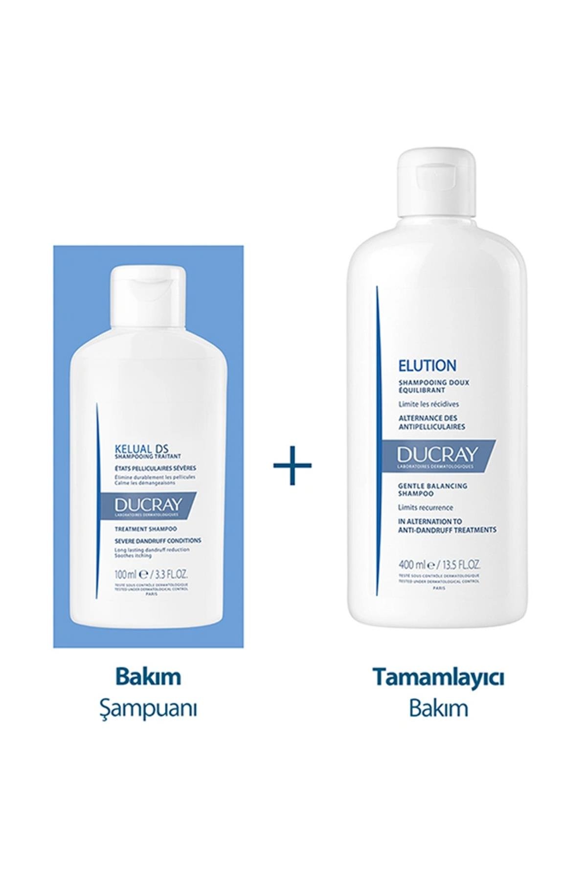 Ducray Kepek Kelual Ds Şampuan 100 ml; Uzun süreli kepek önleyici etkiye sahiptir. Saçlı deriyi hızla yatıştırır. Şiddetli pullanma oranında azalma sağlar. Ducray Elution Şampuan 200 ml; Kepeğin tekrar oluşmasını önlemeye yardımcıdır. Saçın hacmini arttırırken aynı zamanda saçları yumuşatır.