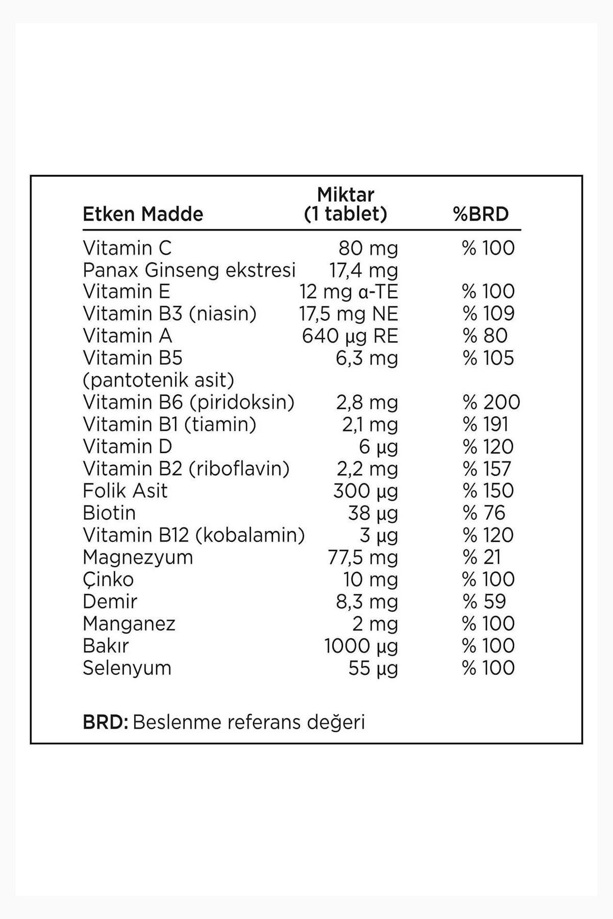 Multivitamin, mineraller ve ginseng g115 içeren takviye edici gıda.